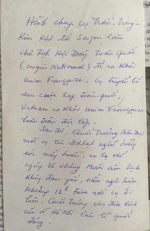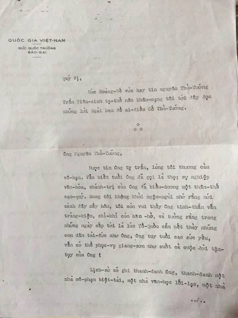 Riêng đối với tôi, tôi không quên rằng trong những giai đoạn khó khăn của lịch sử, lúc nào Ông cũng sẵn sàng hăng hái làm người cộng sự đắc lực của tôi: nào khi Ông nhận đảm đương sứ mạng nặng nề điều khiển con thuyền quốc gia trong khi thế nước chông chênh; nào lúc tòng vong ở nơi hải ngoại khi tôi tranh đấu để mang lại cho dân tộc một hy vọng, một tin tưởng ở tương lai; nào buổi mới đây tuy tuổi đã ngoài 70 mà Ông còn hăng hái đứng lên đảm nhiệm trọng trách chủ tịch hội nghị toàn quốc trong cuộc tường bày ý nguyện của dân tộc.