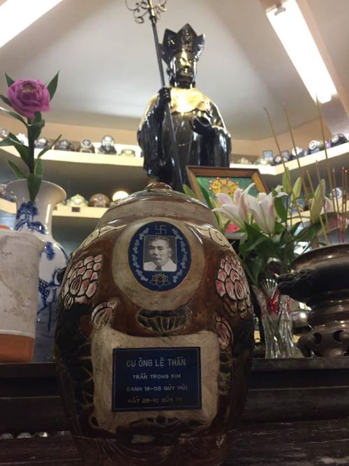 Tro cốt học giả Trần Trọng Kim đang gửi tại chùa Vĩnh Nghiêm (đặt trên giá chung như một người vô danh).