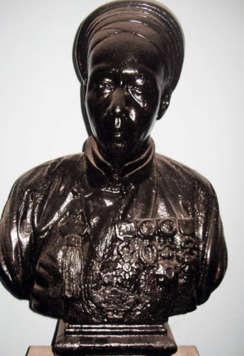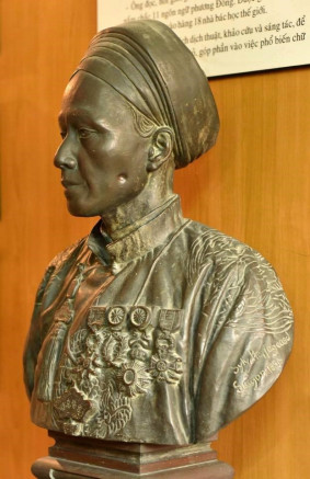 Bức tượng tạc theo chân dung của ông khi còn trẻ, trên ngực ngoài Ngọc Khánh và Long Khánh do vua Đồng Khánh trao tặng, chỉ đeo 4 Huy chương tư`trái sang:
