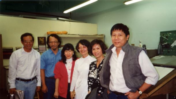 Từ trái: Nguyễn Mộng Giác, hoạ sĩ Nguyễn Đồng, hoạ sĩ Nguyễn Thị Hợp, Nguyễn Khoa Diệu Chi [bà Nguyễn Mộng Giác], nhà phê bình văn học Thụy Khuê và Nguyễn-Xuân Hoàng. Hình chụp tại toà soạn báo Người Việt, do Thụy Khuê gửi, tháng 4, 1990.