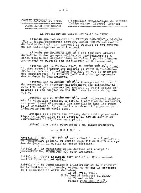 Trong buổi hợp bất thường ngày 25 tháng 4 năm 1947,Ban Chấp Hành Nam Bộ đã đề cử Một Tòa Án Đặc biệt cách chức Ủy viên Đặc biệt của Ông Huỳnh Phú Sổ và tuyên án tử hình Ông vì tôi phản động và âm mưu tạo bất ổn tại Miền Tây trong lúc mọi lực lượng nhân dân phải được bảo vệ để theo đuổi Kháng chiến.