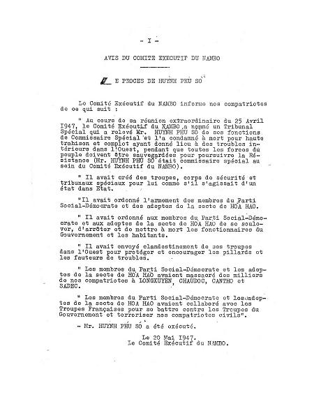 Gần một tháng sau, ngày 20 tháng 5 năm 1947, Ủy Ban Nam Bộ ra Thông Cáo về Giáo chủ Huỳnh Phú Sổ và bản án của Ngài :