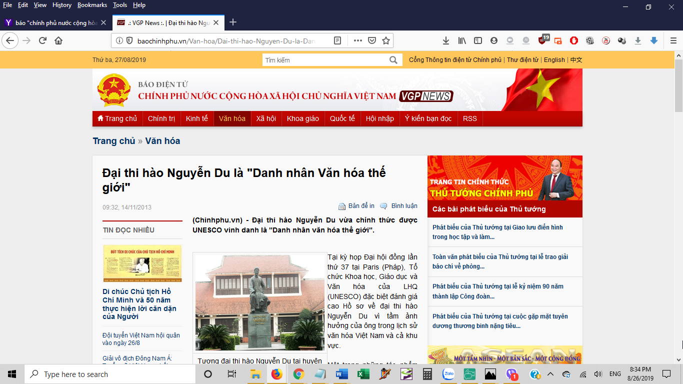 Thông tin mới nhất về việc thi hào Nguyễn Du được UNESCO tổ chức kỷ niệm đăng trên trang Di sản thế giới của Bộ Văn hóa,Thể thao và Du lịch,