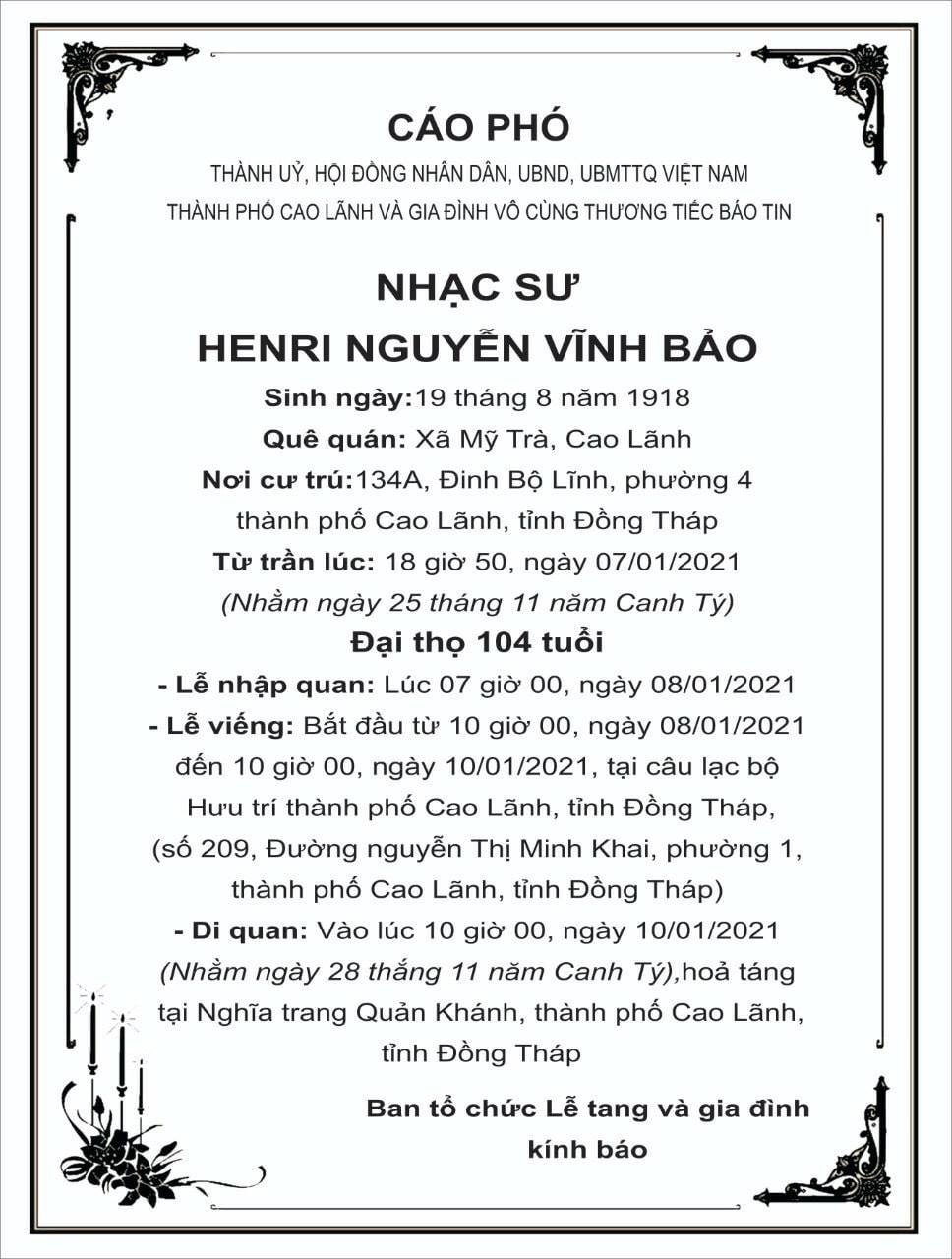 ĐỒNG THÁP - Nhạc sư Nguyễn Vĩnh Bảo mất ở tuổi 104 tại nhà riêng lúc 18h50 ngày 7/1/2021, sau thời gian chữa bệnh già.