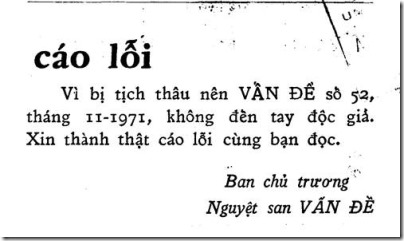 Ví dụ chúng tôi có tạp chí Vấn Đề số 52 – số bị tịch thu – ở xứ Mỹ này khi mà 43 năm về trước trên số 53 đăng lời cáo lỗi cùa Ban Chủ trương nguyệt san Vấn Đề như sau: