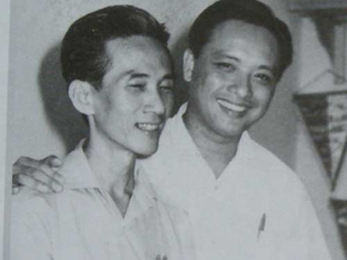 NSND Út Trà Ôn (phải) và NSND Viễn Châu thời trai trẻ. Ảnh tư liệu của NSND Viễn Châu.