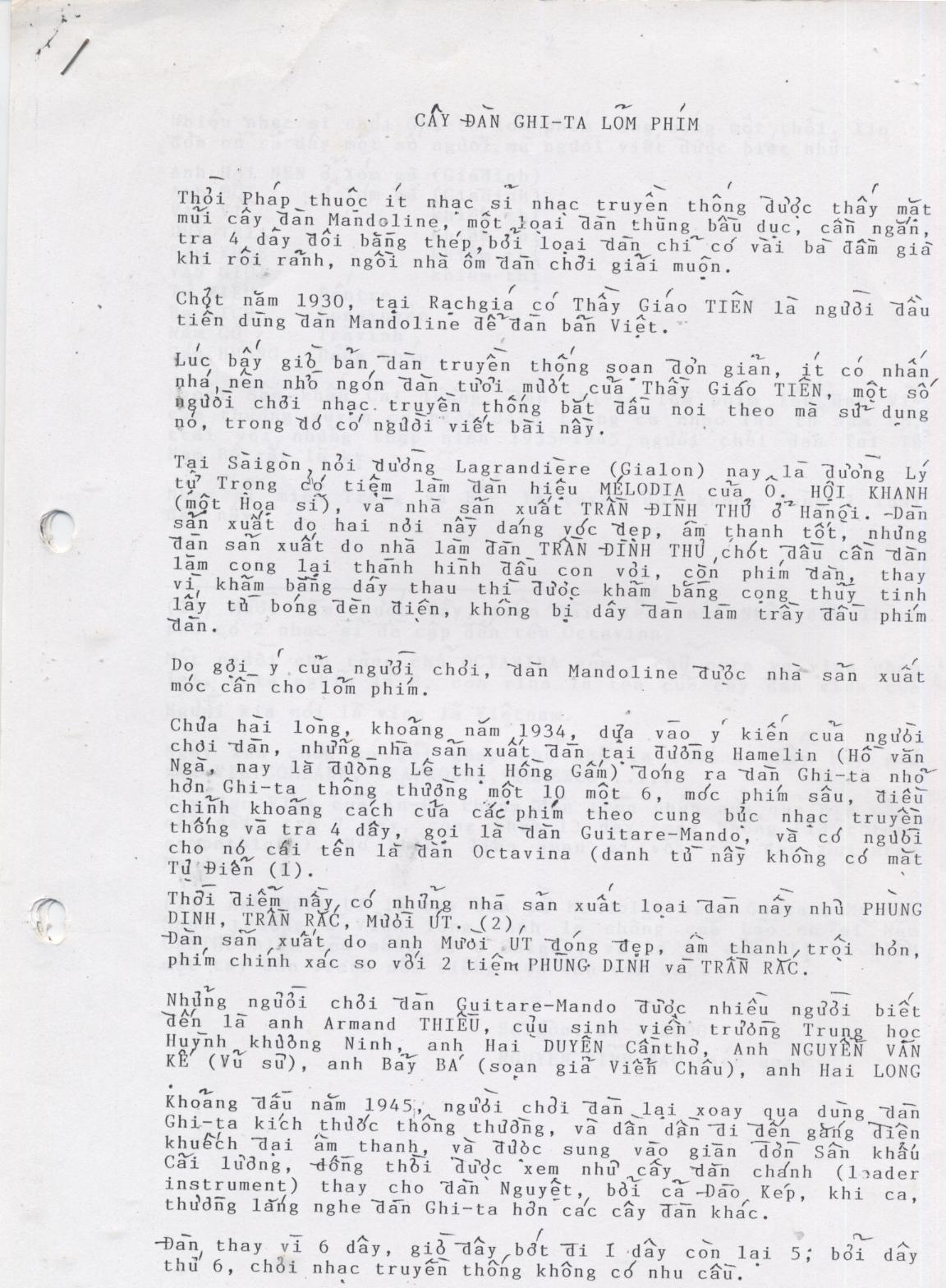 Thời Pháp thuộc ít nhạc sĩ nhạc truyền thống được thấy mặt mũi cây đàn Mandoline, một loại đàn thùng bầu dục, cần ngắn, tra 4 dây đôi bằng thép, bởi loại đàn này chỉ có vài bà đầm già khi rỗi rãnh, ngồi nhà ôm đàn chơi giải muộn.