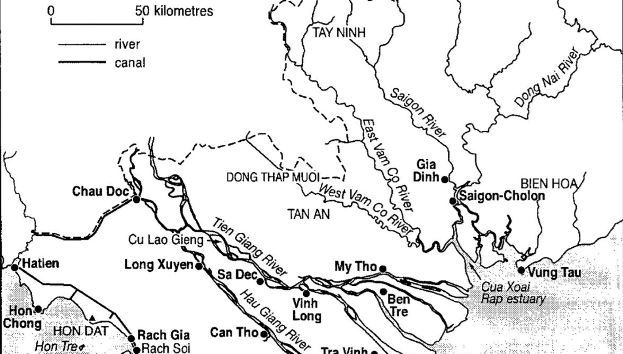 Bản đồ Châu thổ Mekong và đường biên giới hiện đại Việtnam –Campuchia. Nguồn: Li Tana và Nola Cooke. Water Frontier, 2004, tr. 136